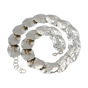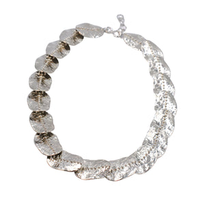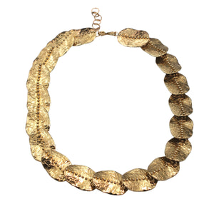 The Aegis Collar features a large, overlapping textured link design that creates a bold statement piece. Expertly crafted, this necklace combines intricate texture with substantial form, offering a sophisticated accessory that enhances any ensemble with a modern edge. Ideal for those seeking a distinctive and refined look.