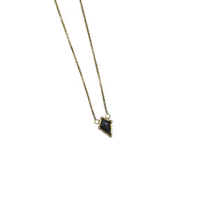 The Kite Drop necklace, featuring a rustic rose-cut grey diamond set in lustrous 10k gold. Suspended from a delicate 16" chain, this piece offers subtle sophistication perfect for everyday wear. Its unique diamond cut and warm gold setting create a timeless accessory that enhances any outfit with understated charm. Available with gold or oxidized silver chain.