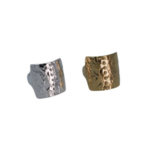 The Dotted Pavise Ring features a textured rectangular shield design enhanced with linear dot detailing. This expert-crafted piece combines bold geometry with subtle embellishments, offering a distinctive accessory that balances strength and sophistication.